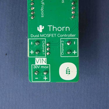 Thorn is a powerful and compact Dual MOSFET Controller designed to add smart switching and precise control to any DC-powered device. It supports 6–30V input and handles up to 10A continuous current per channel, making it perfect for controlling motors, lights, pumps, and other high-power loads. Fully compatible with the Sprig ESP32-C3 Development Board and the SprigStack ecosystem, Thorn supports PWM control for dimming and speed regulation. Whether you're automating your home, building robotics, or upgrading existing devices, Thorn delivers efficient, reliable performance with plug-and-play simplicity.